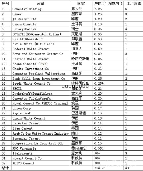 注:白水泥產(chǎn)能集中在北非和中東地區(qū),還有一些分布在北美、印度和歐洲。 白水泥生產(chǎn)企業(yè) 2015年跨國(guó)白水泥企業(yè)有32個(gè),共有48個(gè)水泥廠,分布在28個(gè)國(guó)家。這些企業(yè)的白水泥產(chǎn)能總計(jì)有1420萬(wàn)噸/年(見(jiàn)表2)。這個(gè)統(tǒng)計(jì)數(shù)據(jù)不包括7個(gè)雙線企業(yè),這些企業(yè)只統(tǒng)計(jì)了灰水泥產(chǎn)能或綜合水泥產(chǎn)能。該數(shù)據(jù)也不包括單獨(dú)粉磨站生產(chǎn)的白水泥產(chǎn)能。 表2: 全球白水泥生產(chǎn)企業(yè)分布及產(chǎn)能情況