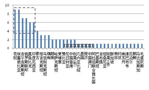 數(shù)據(jù)來(lái)源:商務(wù)部,中國(guó)水泥網(wǎng),中國(guó)水泥研究院 圖2:中國(guó)境外投資企業(yè)(水泥生產(chǎn)銷售業(yè)務(wù))數(shù)量(按國(guó)家)