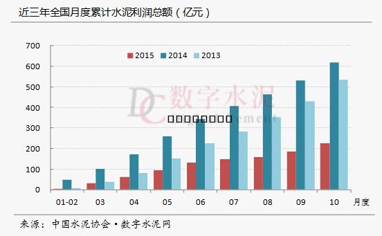 從近三年的水泥行業(yè)月度盈利情況來看, 2015年前十個月的累計利潤總額不及2014年前5個月和2013年前6個月的利潤總額,與前兩年相比,累計利潤總額減少300-400億元,今年的行業(yè)盈利水平大幅降低。