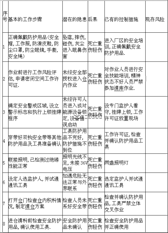 德通鋼板倉清庫部為了督促每個項目部制定完善的清庫施工方案,為了降低清庫人員勞動強度以及方便制定清庫應(yīng)急預(yù)案等等,必須對水泥庫清庫施工風(fēng)險進行評估并制定風(fēng)險評估表。