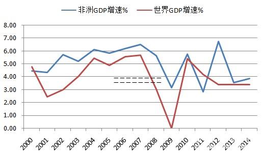 非洲有不容忽視的潛力 水泥消費(fèi)與人口分布較為一致,2014年亞洲(除中國外)、非洲人口占海外總?cè)丝诘?0.8%和19.81%,而水泥消費(fèi)量比重分別為49.98%和16.57%,非洲消費(fèi)比重低于人口比重源于較低的人均水泥消費(fèi)量,人均消費(fèi)量估計(jì)在230公斤左右,北非以外的非洲國家人均產(chǎn)能甚至不足145公斤,人均水泥消費(fèi)量更低。2014年,在世界經(jīng)濟(jì)總體放緩的背景下,非洲依然能保持良好的增長勢頭,基建及內(nèi)部需求支撐了經(jīng)濟(jì)的活力,加之較低的人均水泥消費(fèi)水平表明非洲水泥市場有不容忽視的潛力。 圖4:非洲經(jīng)濟(jì)保持良好增長勢頭(%)
