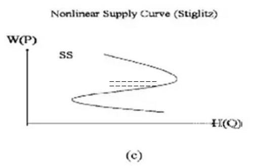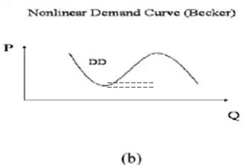 圖1:線性和非線性的供求曲線,對應(yīng)自穩(wěn)定和非穩(wěn)定的市場機(jī)制。 新古典經(jīng)濟(jì)學(xué)給出的自穩(wěn)定的市場機(jī)制:需求曲線DD斜率為負(fù),供給曲線SS斜率為正。兩者只有一個交點(diǎn)即市場的均衡態(tài)。條件是需求方是“理性人”能做獨(dú)立的優(yōu)化判斷,規(guī)避風(fēng)險,不受他人影響。供給方滿足規(guī)模報酬遞減或不變,只求利潤最大化,不追逐市場份額。