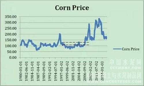 玉米的價格波動更為頻繁。2004年10月為93.37, 2008年6月升到267.11,4年不到漲了近2倍;到2009年9月跌到150.57,一年多跌去44%;2012年7月回升到332.95,3年漲了1.2倍;2015年8月跌到162.74,3年跌去過半。