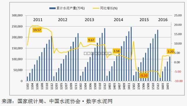 根據(jù)國家統(tǒng)計局統(tǒng)計,2016年1~6月份,我國水泥產(chǎn)量11.1億噸,同比增長3.2%,自3月以來累計水泥產(chǎn)量連續(xù)4個月穩(wěn)定在3%以上的低速增長,高于2015年(本世紀首次下滑年份),但低于2014年(歷史峰值年份)。