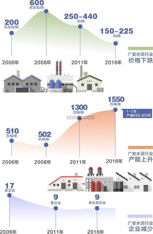 新項目在不斷上馬。2009年廣安新增新型干法生產(chǎn)線兩條,淘汰落后生產(chǎn)線兩條,年產(chǎn)能擴大至803萬噸。2010年,廣安市水泥產(chǎn)能突破1000萬噸,2011年底再次突破1300萬噸,但行業(yè)集中度有所提高,僅剩下9家企業(yè)。