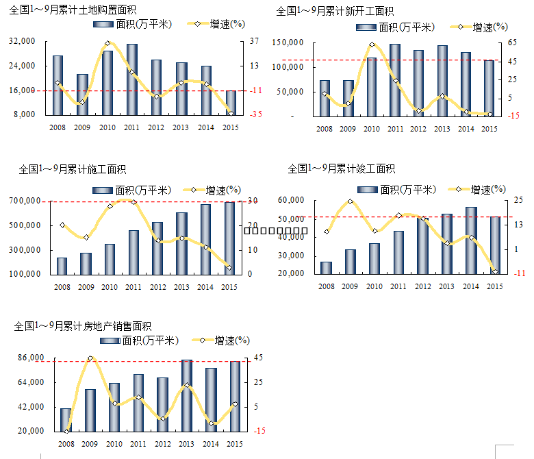 房地產(chǎn)除銷售指標外,其他指標增速都呈下行趨勢,下行指標中除施工面積外都為負增長;2015年,土地購置面積低于2008年;新開工面積低于2010年;竣工面積低于2013年。