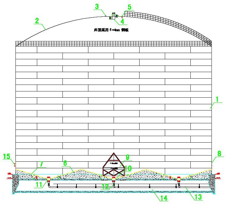 大型鋼板倉原理圖 1—庫體;2—庫頂;3—料位計;4—入料管;5—安全閥;6—導(dǎo)料錐; 7—環(huán)形內(nèi)區(qū)氣化管;8—環(huán)形外區(qū)氣化管;9-減壓錐;10—中心區(qū)氣化管 11—垂直下料口;12—下料閥;13—出料涌管;14—廊道;15—人孔及觀察孔 。 (1)、當(dāng)物料存到一定料位后,先打開放風(fēng)閥使其空運慢慢關(guān)閉放風(fēng)閥由鋼板庫外圍的住進(jìn)氣管道將風(fēng)送入庫內(nèi)、通過電磁閥氣流分別進(jìn)入外環(huán)內(nèi)環(huán),將物料達(dá)到活化狀態(tài),經(jīng)發(fā)送器的集料、射流作用,物料進(jìn)入輸料涌管。 (2)、輸料涌管采用外置管式助氣增壓輸送裝置,輸料管內(nèi)通入一定的風(fēng)量進(jìn)入輸料管中,物料的粒群在輸料管中松散開,物料顆粒均被懸浮在氣流中,呈現(xiàn)類似流體的特性,具有較好流動性。物料輸送的動力來源三部分:1)、下料口下為正壓推送(卸料氣壓產(chǎn)生的物料流化壓力);2)、提升機(jī)喂料口處收塵器負(fù)壓吸送;3)、發(fā)送器的主吹射流及輸料管的助吹補(bǔ)氣。這種管道氣力輸送方式的輸送物料料氣比可達(dá)200以上,屬于超高密相氣力輸送(料氣比>30為密相氣力輸送),可以滿足各種提升機(jī)產(chǎn)量需求。 (3)、內(nèi)外環(huán)區(qū)相鄰卸料槽間設(shè)置導(dǎo)料錐,導(dǎo)料錐的作用:1)、增設(shè)導(dǎo)料錐可以減少庫內(nèi)積料,提高鋼板庫卸空率。2)、庫底導(dǎo)料錐可以將物料匯集到相鄰槽間,提高壓縮空氣的使用效率增加逐流作用。 (4)、可以提高充氣面積,使庫底物料更蓬松,增加物料流動性。 (5)、在儲存庫底環(huán)形卸料區(qū),每幾供氣區(qū)為一個獨立卸料單元。1-7個卸料單元,由一條裝有電磁閥(電動閥門)的管道供氣,外環(huán)形卸料和內(nèi)環(huán)形卸料區(qū)為高壓供氣區(qū)。儲存庫供氣系統(tǒng)由若干電磁閥(電動閥門)配合電控柜,既可實現(xiàn)本地手動、自動控制,也可連接中控實現(xiàn)遠(yuǎn)程自動化控制。 |
